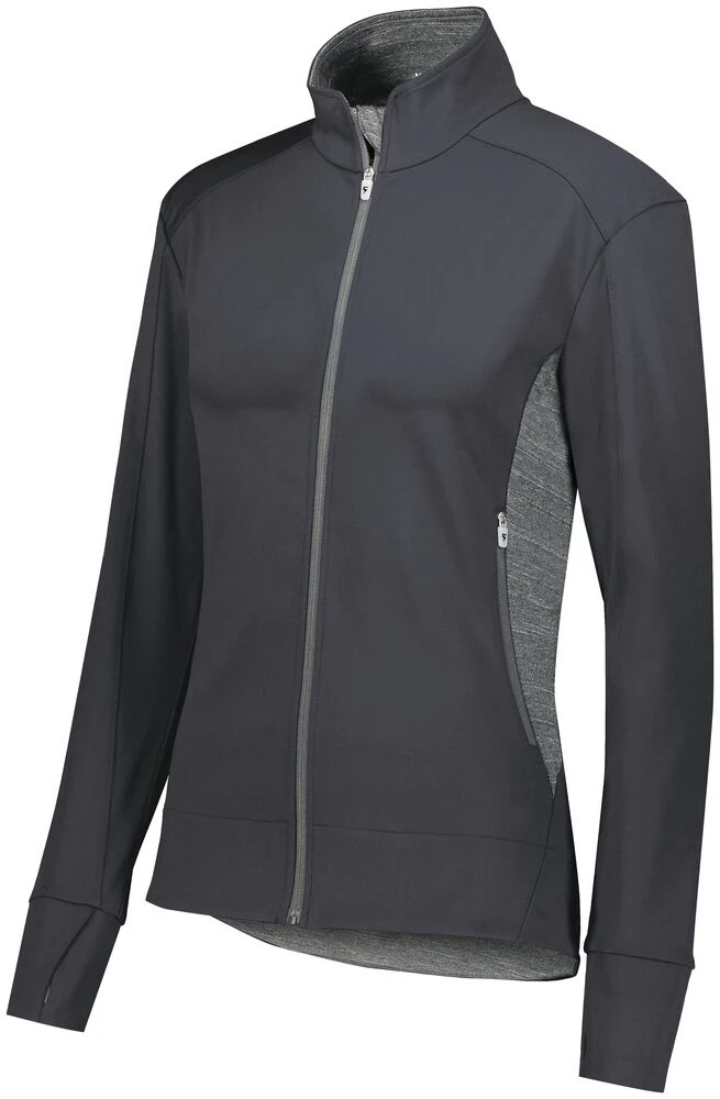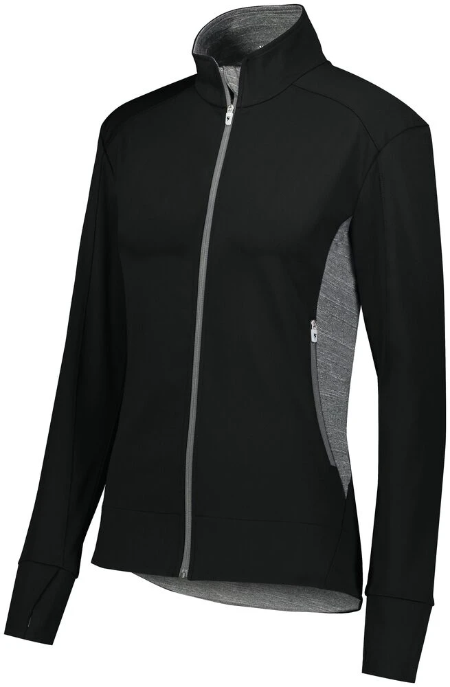 Bring style to the sideline in our Ladies Free Form Jacket. This heavyweight 78% polyester/22% spandex jacket features 4 way stretch and wicks moisture away from the body. Heather inserts on the sides, inside collar, zipper garage, and inside hem add flattering contrast. This tailored jacket is all about the details with overlapping thumbholes, zipper enclosed pockets, and reverse coil zippers with metallic teeth for pops of metallic interior detail. It’s a perfect fit for volleyball, dance, or cheer.
