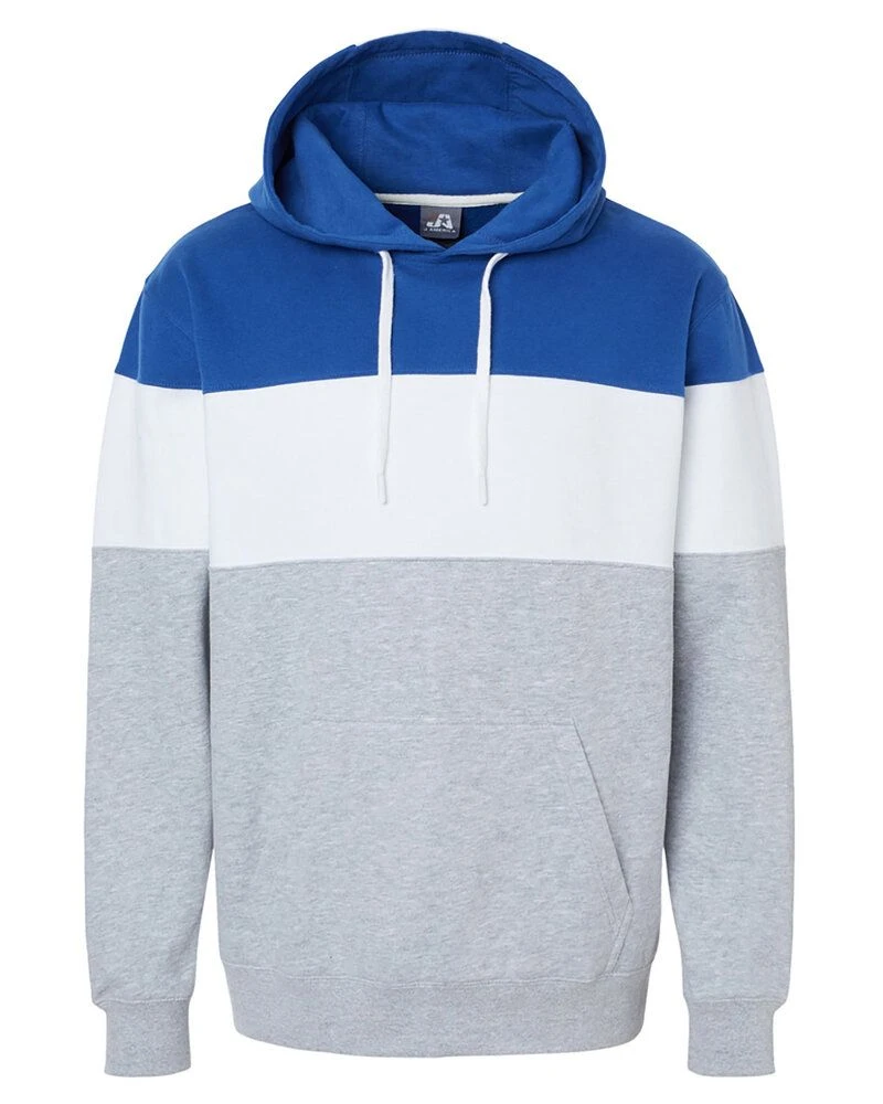 8 oz., 60% cotton, 40% polyester sueded fleece; 3-piece jersey-lined hood with sewn eyelets and contrast drawcords; Contrast self fabric panels on chest, arms, and hood; Contrast twill tape back of neck tape; 1×1 rib cuffs and waistband; Set-on pouch pocket; Tear away label