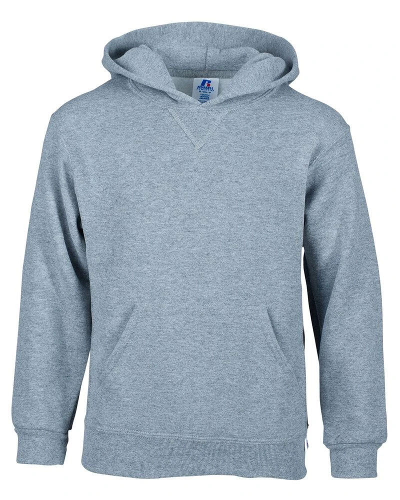 9.3 oz., 50% cotton, 50% polyester; Oxford: 48% cotton, 52% polyester; Pre-shrunk 3-end fleece; Dri-Power® moisture-wicking technology; Made with sustainably sourced USA grown cotton ; Medium Grey Heather coverseam tape; V-patch detail at front neck; 2-ply hood ; Front pouch pocket; Eagle R logo flagtag at waistband; CPSIA compliant: Russell Athletic® youth products and packaging comply with the tracking label requirements of the Consumer Product Safety Improvement Act